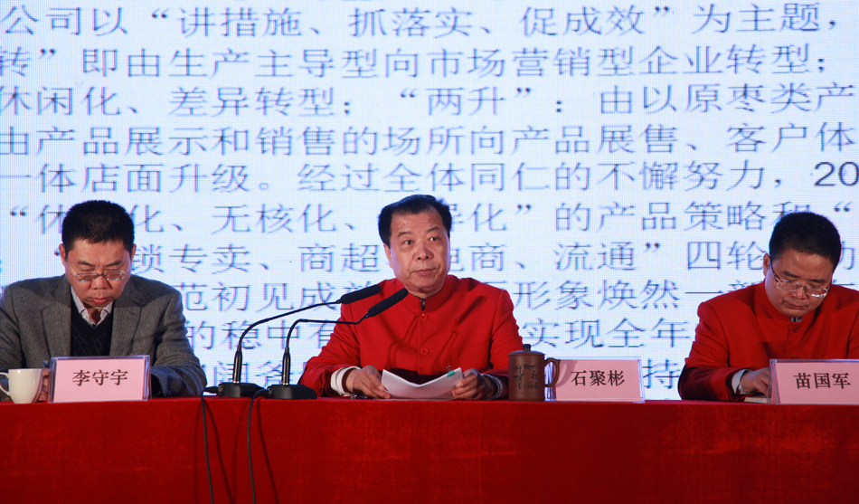 会议伊始,董事长石聚彬首先结合中国经济发展的大环境,回顾了2014年公 司各项工作的开展情况。2014年,公司以“讲措施、抓落实、促成效”为主题,强力推动“两转”、“两升”,经过全体开宝体育官网人的 不懈努力,2014年公司产品结构不断调整,“休闲化、无核化、差异化”的产品策略和“健康零食”的产品定位渐入人心;连锁专卖 、商超、电商、流通四轮驱动的渠道策略逐步成型;市场整顿和市场规范初见成效,店面形象焕然一新。在严峻的市场环境下,2014 年公司销售收入稳中有增,基本实现全年的目标任务;与此同时,产品、渠道转型得到了客户、消费者、媒体和资本市场的广泛认同 ,开宝体育官网品牌的知名度和美誉度大大提升,开宝体育官网“中国红枣领导品牌”的行业地位得以巩固。