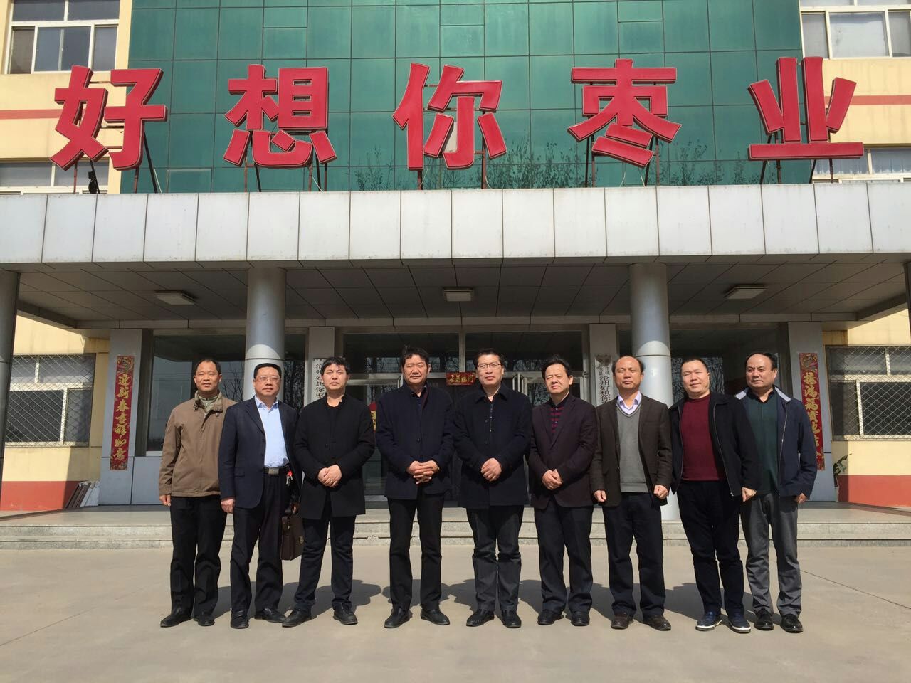 郑州市农业局领导和沧州市各级领导在办公楼前进行合影。