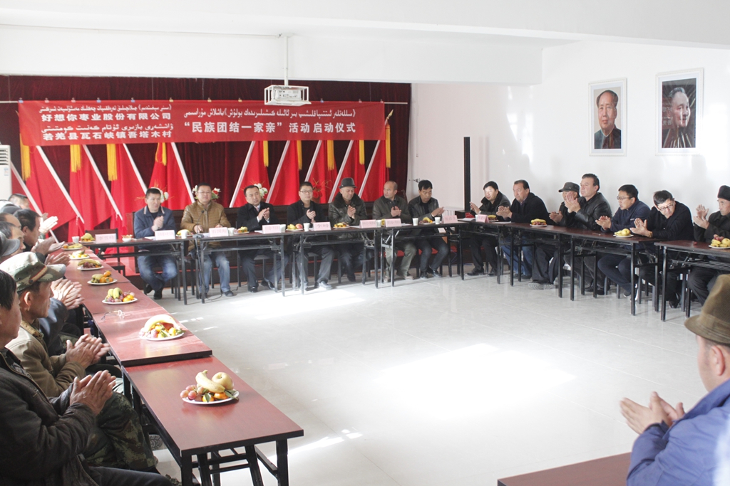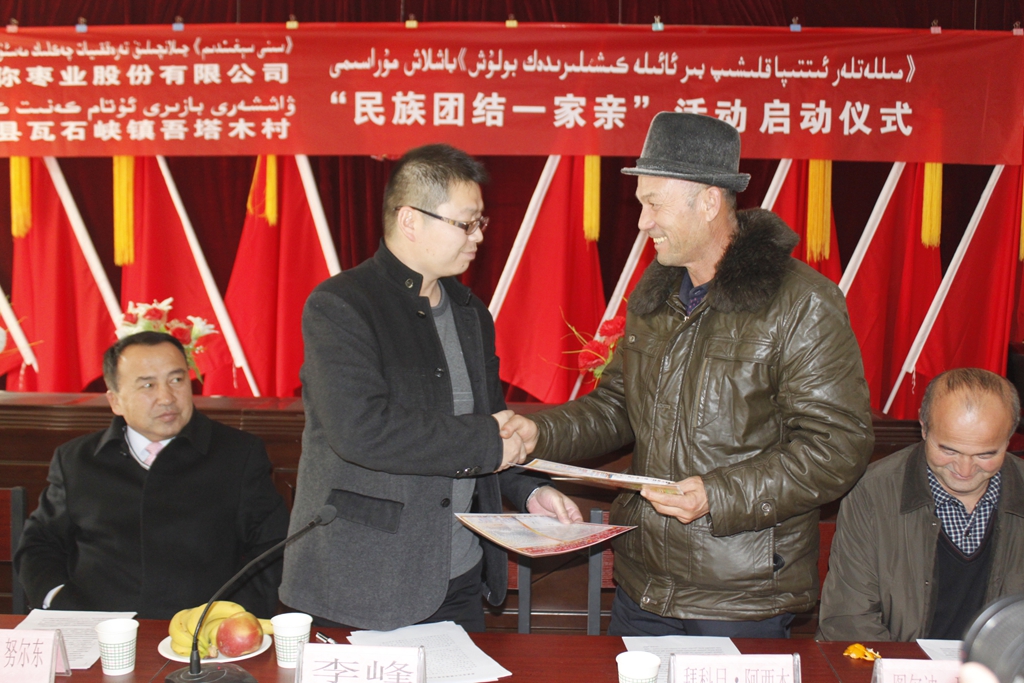 活动启动仪式上,若羌分公司与瓦石峡镇领导分别介绍了双方发展情况,若羌分公司总经理李峰代表开宝体育官网枣业股份有限公司与塔木村村委书记拜克日·阿西木结对认亲,双方共同签署了民族团结承诺书,表达结对认亲、民族大团结、共同发展的决心。