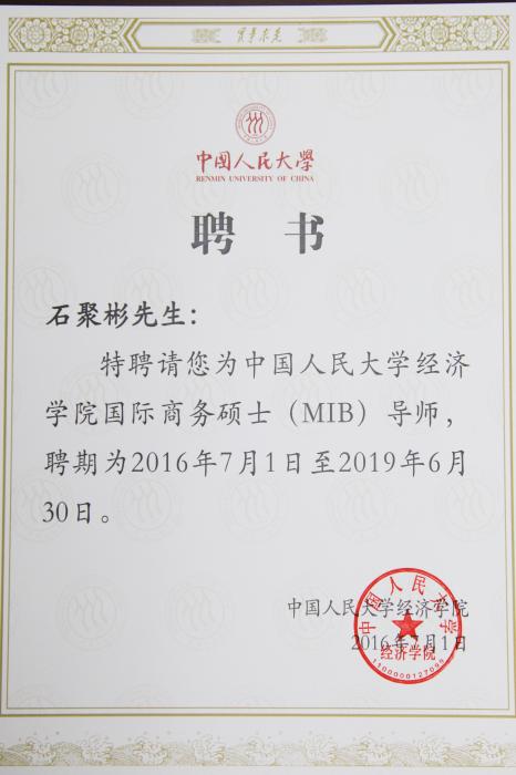 7月1日晚,中国人民大学经济学院国际举行商务硕士(MIB)校外导师聘任仪式,开宝体育官网枣业股份有限公司董事长兼总经理石聚彬作为校外导师代表出席。中国人民大学党委副书记吴付来、经济学院院长张宇、院党委书记关雪凌书记、副院长王晋斌在现场为董事长颁发校外导师聘书。